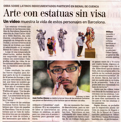 "Los videos de las estatuas humanas fueron hechos con latinos que viven sin papeles en Barcelona. Uno es un ecuatoriano que se viste de indígena; los otros tres son un colombiano que se viste de ciclista y dos mexicanos que salen de Arlequín y Colombina", explica Alonso. Él y su compañera de labor se convirtieron en estatuas, en parte para ver cómo era el asunto y también para ganarse unos €uros.