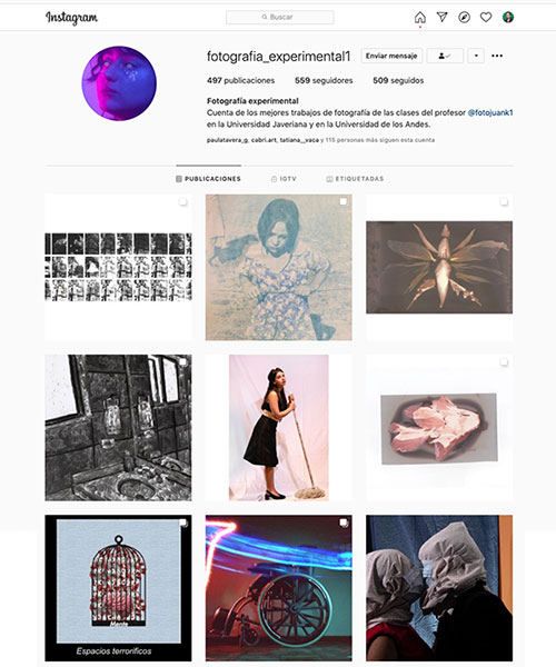 The websites titled "EXPERIMENTAL PHOTOGRAPHY" make short work of the creative process of the best works of my photography students of the classes that I give in different universities at Bogotá. In this way the classroom become in an experimentation center in photography where we are looking for a coherence between the different photography technics and the themes that present the students, always with the purpose of the relation between the photografphy and the fine and visual arts. The Flickr portal was created in 2013 and from 2020 the platform migrated to Instagram where each semester is updated with new work done in class. These works belong to the classes of "Basic Photography", "Advanced Photography" and "Experimental Photography" of the Javeriana University; "Portrait Photography" and "Photography I" of Los Andes University; "Art Photography" and "Expression Technics in Analog Photography" of Jorge Tadeo Lozano University; and "Photography II" of the National University of Colombia. |