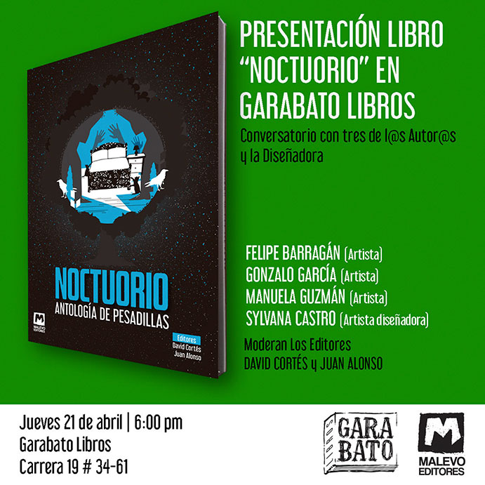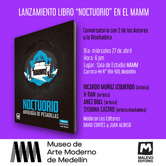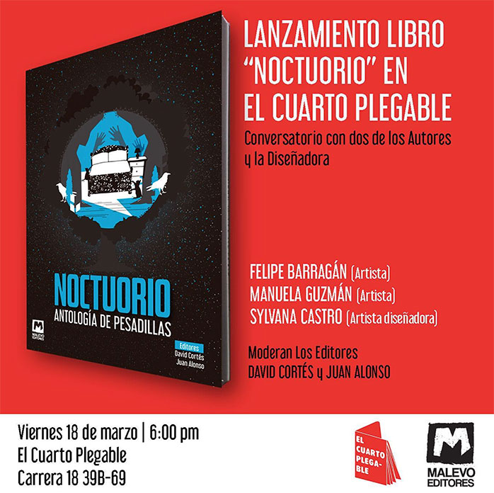 MALEVO EDITORS (David Cortés, Juan Alonso) will launch the book NOCTUORIO. ANTHOLOGY OF NIGHTMARES with some of its authors. Online event of the Republik Bank, Santa Marta headquarters, on Friday, December 17, 10am.