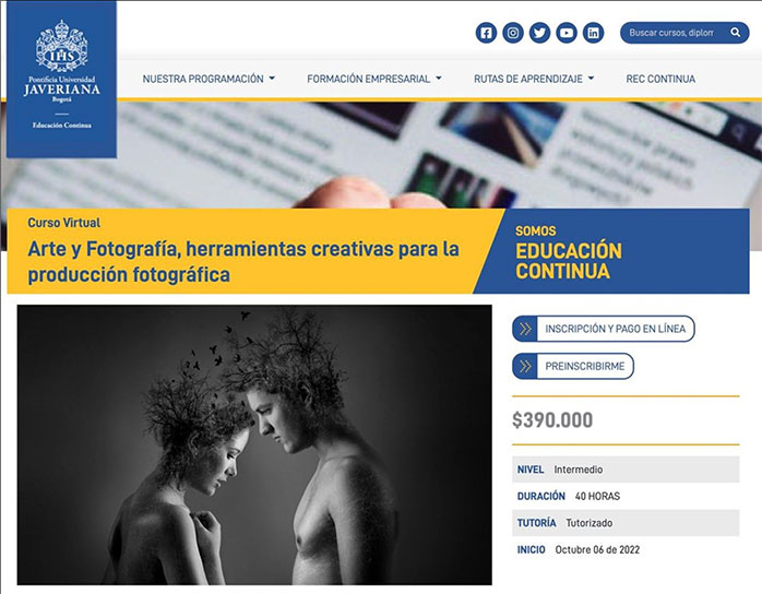 Invited to enroll in the Virtual Course ART AND PHOTOGRAPHY. CREATIVE TOOLS FOR PHOTOGRAPHIC PRODUCTION, Continuing Education program of the Javeriana University. Registrations here.