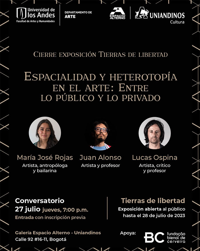 On Thursday, July 27 at 7pm invited to the talk "Spatiality and heterotropy in the are: between the public and the private" with María José Rojas and Lucas Ospina in Uniandinos, as part of my exhibition LANDS OF FREEDOM at the Espacio Alterno Gallery.