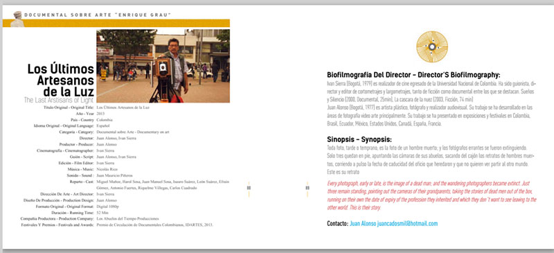 CATALOGUE OF THE "BOGOTÁ FILM FESTIVAL WITH "THE LAST CRAFTSMEN OF LIGHT", Documentary presented at Theatre National House and Uniandinos.