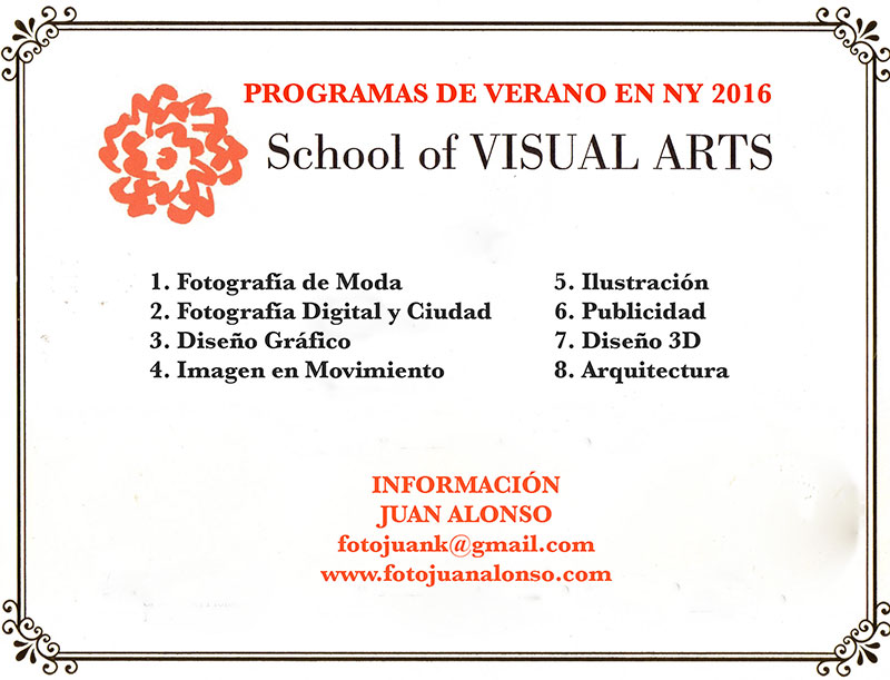 PREPARING THE GROUP OF STUDENTS TO GO TO THE SUMMER WORKSHOPS OF THE SCHOOL OF VISUAL ARTS IN NEW YORK, FOR THE PROGRAMS OF "FAHSION PHOTOGRAPHY", "STREET PHOTOGRAPHY", "GRAPHIC DESIGN", "MOVING IMAGE", "ILLUSTRATION", "ADVERTISING", "3D DESIGN" AND "ARCHITECTURE". More info here