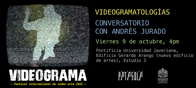 VIDEOGRAMATOLOGIES. TALK WITH ANDRÉS JURADO. FRIDAY OCTOBER 9th, 4PM, JAVERIANA UNIVERSITY, GERARDO ARANGO BUILDING, STUDY 3. Event made with the support of the Visual Arts Department.