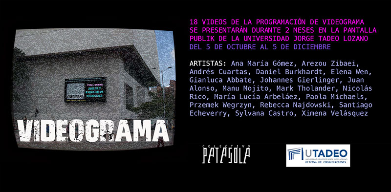 18 VIDEOS FROM VIDEOGRAMA WILL BE PRESENTED FOR 2 MONTHS AT THE PUBLIK SCREEN OF THE JORGE TADEO LOZANO UNIVERSITY. OCTOBER 5 TO DECEMBER 5.Event made with the support of the Comunication Office of the UJTL